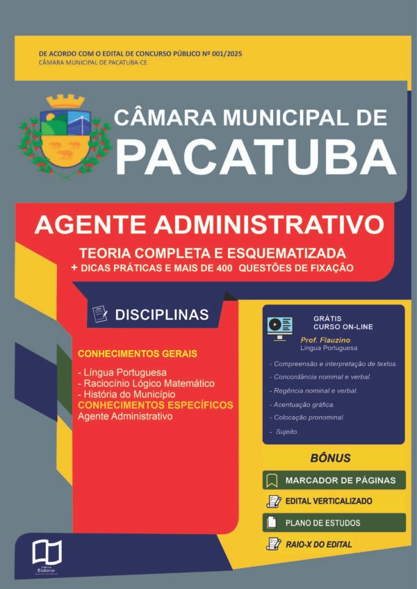 Estude para o Concurso da Câmara Municipal de Pacatuba 2025 com um material de acordo com o Edital oficial para o cargo de AGENTE ADMINISTRATIVO.